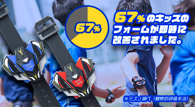ミズノの調べによると、小学校1~2年生に「ダッシュドライバー ゼクー」を着用してもらい、かけっこの練習を行ったところ67%のキッズフォームが即時に改善されたという検証結果が出ました。