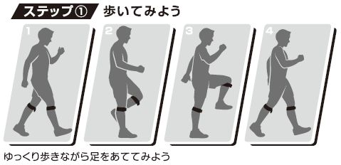 「足を上げる時に、足の甲が反対側の足に装着したターゲットに当たるように意識して歩きます。」