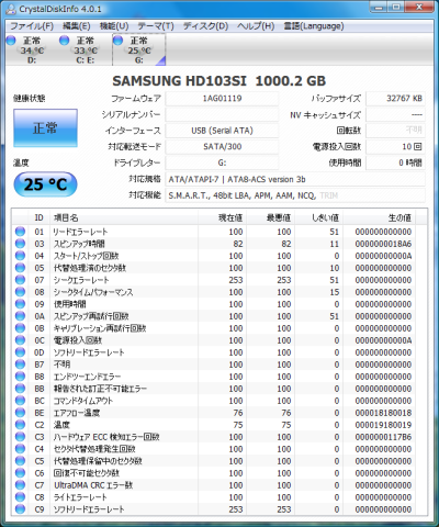 CrystalDiskInfoで搭載ドライブのステータスを表示してみたところ、搭載されているドライブはSAMSUNG HD103SIと表示されました。