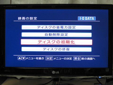 HVTR-BTLと接続したらメニュー画面をひらいて”メインメニュー”に進み”録画の設定>ハードディスクの初期化”を選択してAVHD-U1.0Qを初期化します。