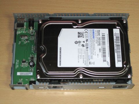 本体のカバーは背面側に設置されているネジを2本で固定されています。電源とUSBコネクタとSATA端子は一体成型の基盤で構成されていてます。HDDは3.5インチでゴム製ダンパー4個で固定されています。HDDは交換することは可能ですがHDD固定ネジのうち2箇所は製品のラベルシールで封印されているので交換作業を行うとメーカー保証を受けられなくなると思います。