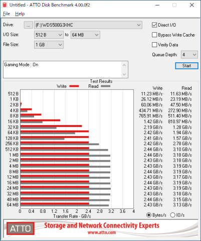 さて、それではこのゲームモードがパフォーマンスにどの程度影響を与えるのか、ATTO Disk Benchmarkをデータサイズ1GBで3回連続で回して、結果を比べてみましょう。