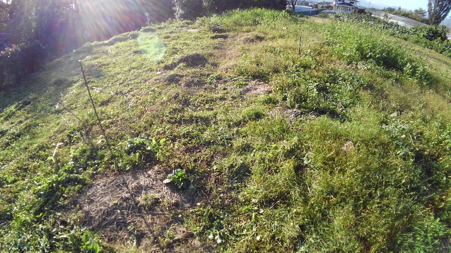 写真の左側が草刈り完了した部分で、右側がこれからです。たった3週間放置しただけで、自分の胸あたりまで草が伸びています。