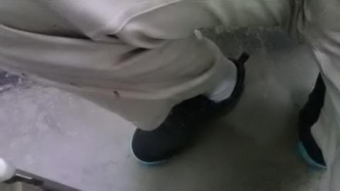 作業は、Pタイルの床に業務用洗剤を散布してポリシャーを使って洗います。