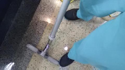 その後、バキュームで汚水を吸い取ってモップ拭きをして乾かしてからワックスを塗ります。