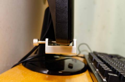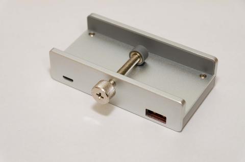 側面から見た「ORICO USB3.0 ハブ 4ポート クリップ式」です。モニターの厚みに対して空きがあるので、十分ねじでの固定が可能です。しかし、モニターの枠が写真のよう丸みがあり斜めになっていたりと側面が直角でないので、やや固定に問題があります。ギリギリ固定している感じになります。