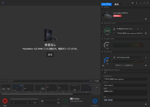 Elgato の 「GameCaptureHD」でもほぼ同様の設定で配信してみた。