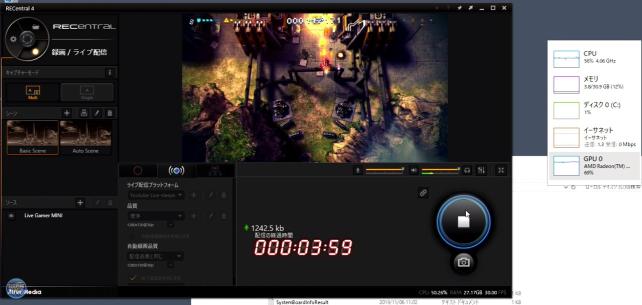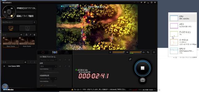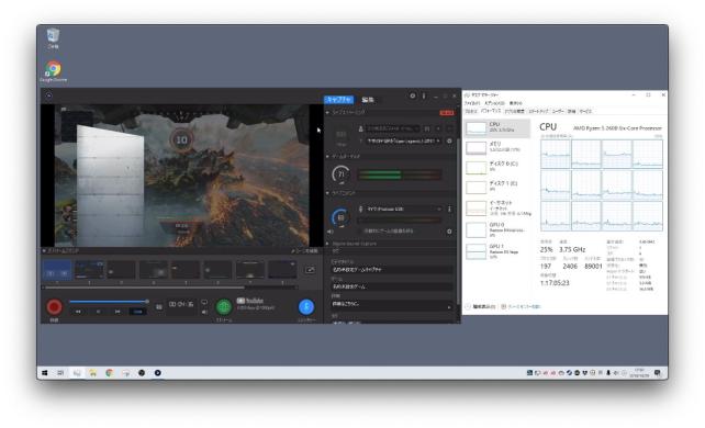 では早速配信の様子です。今回は右側にタスクマネージャーも合わせて配信