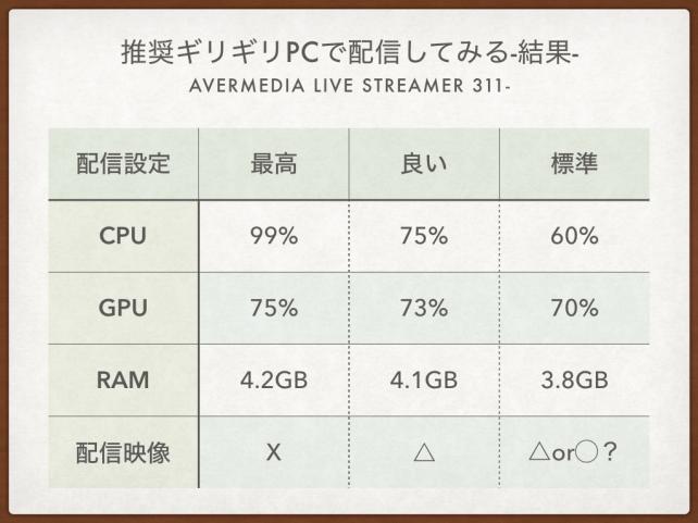 結果としては、推奨スペクギリのPCでは最高設定では配信がかなりきつい状態でした。