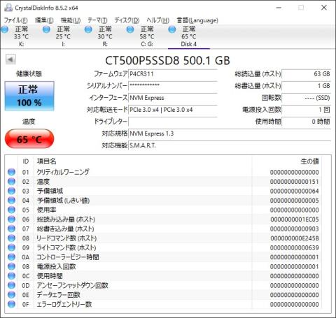 CrystalDiskInfoの温度設定を68度にしているが警告音は鳴らなかった