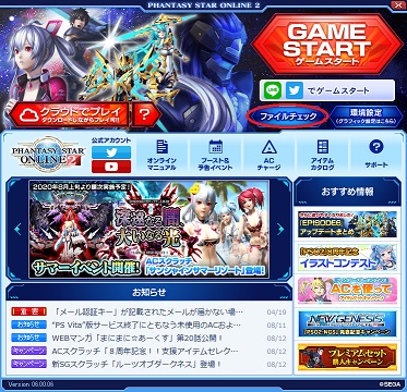 セガのオンラインゲーム ファンタシースターオンライン2のランチャーにあるファイルチェックを押すだけテスト