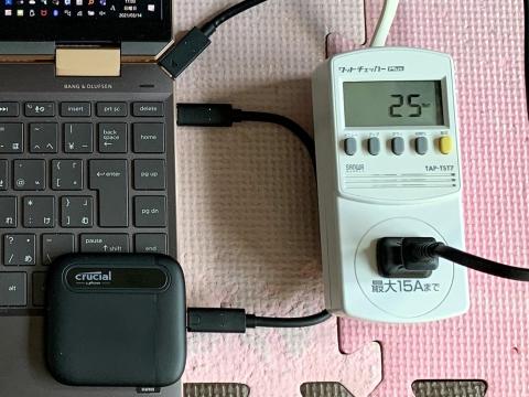 ②「Crucial X6 Portable SSD」でCrystalDiskMarkの記録中の消費電力が25w