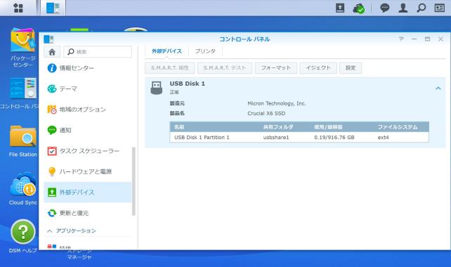 まず、DS215+のUSBポートに「Crucial X6 Portable SSD」を繋いで「外部デバイス」からNASで認識してることを確認します。