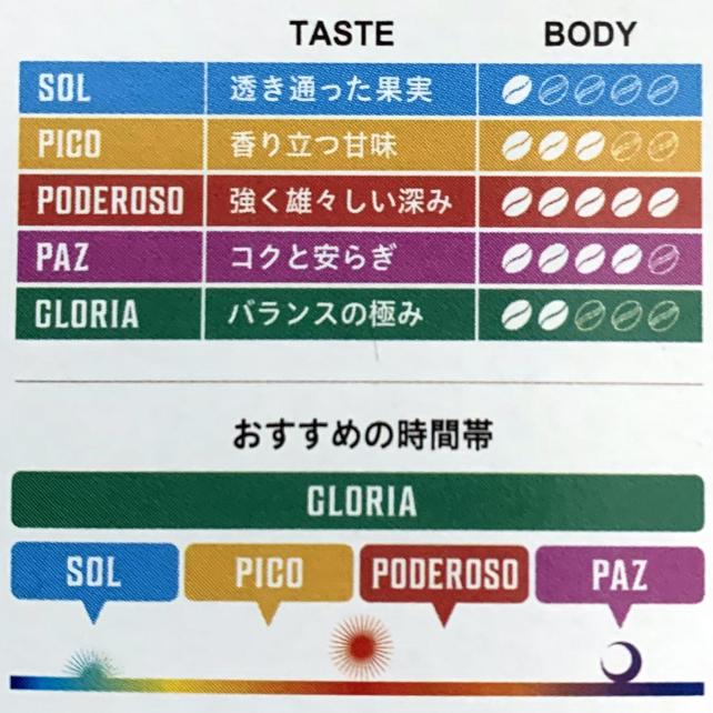 なお、パッケージの側面に公式の豆の感じやオススメの飲む時間帯が掲載されてます。コーヒーは当方も好きですけど、時間帯を記載するコーヒーってすごく珍しい!って思っちゃいました。