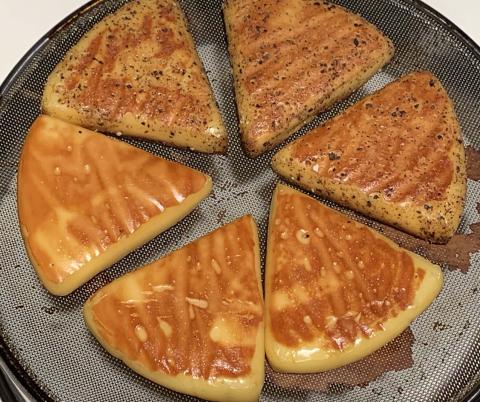 と言うことで、家の中で普通にコーヒーと合わせることにしました、風乾させない場合は、タール分と、食材の水分と結びつき、酸味が上がるので、(酸味が上がると燻製としては失敗なのですが)コクはチーズから、スモークチップからは少しの酸味、これとコーヒーが相まって良い感じに仕上がりました