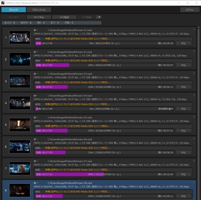 『NEC』LAVIE Direct N15(R)に搭載されている、AMD Ryzen 7 4700Uは、8コア8スレッドなので、Pegasys TMPGEnc Video Mastering Works 7のバッチエンコードツールで8本同時にエンコードさせてみました。