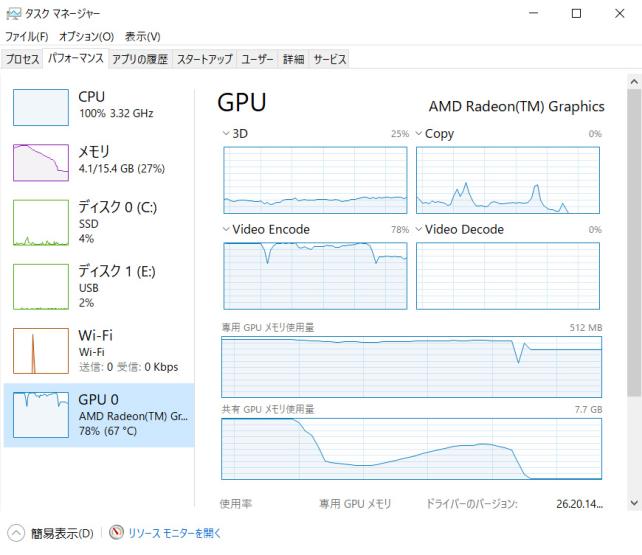 GPUは、ビデオエンコードは、80%-100%の間で推移し、GPU専用メモリは、ほぼ使い切っています。
