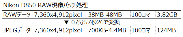 このアプリに、バッチ処理で、100コマのデジタル一眼レフカメラ(8,256x5,504=約4,500万画素)で撮影したRAWデータを同サイズのJPEGデータに現像圧縮するものです。