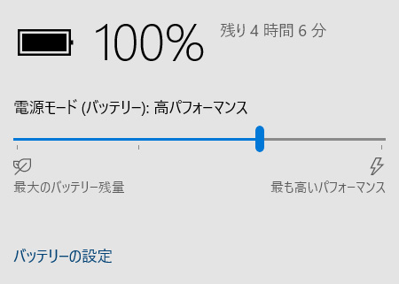 また、バッテリの電源モードは、デフォルトで高パフォーマンスになっていました。