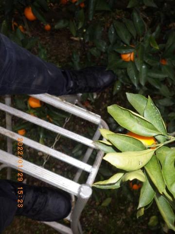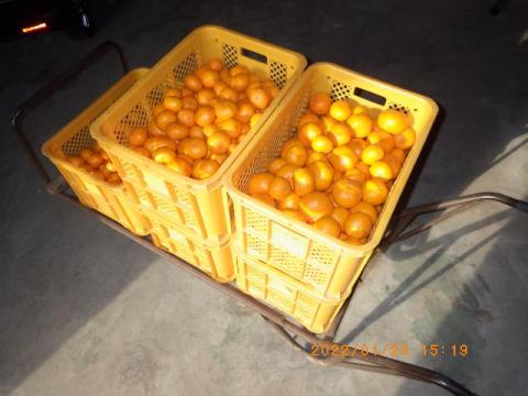 朝から、昼と数時間 履き 蜜柑を採り、コンテナに詰め 一輪車で運ぶと