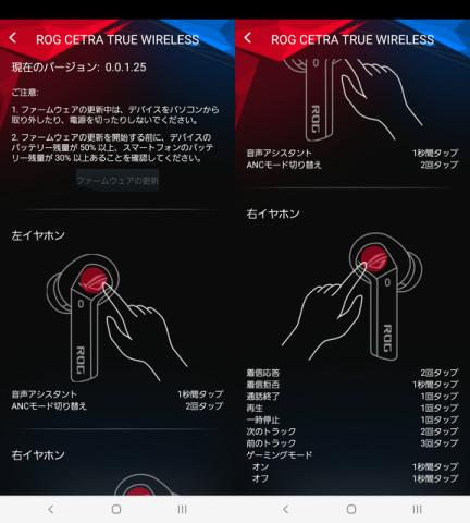 画面右上の歯車マークをタップすると「ROG Cetra True Wireless」の現在のファームウェアのバージョンと、イヤホン本体の操作説明が表示されました。