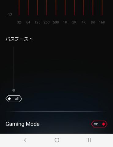 画面をスクロールすると、イコライザーの下に「バスブースト」と「Gaming Mode」が。