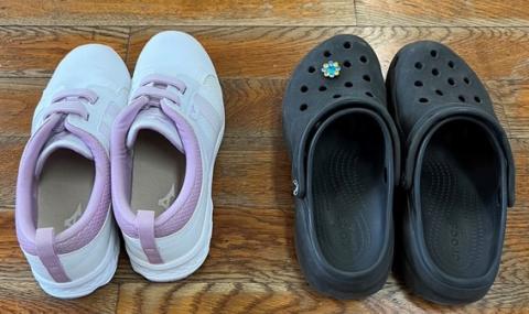 靴を使い分けている理由は、着脱がけっこう面倒だからです。室内といっても、職員の部屋と利用者さんの部屋の行き来は同じ靴でいいのですが、トイレや水回りに行くときには衛生面などからも、スリッパなどに履き替える必要があります。以前履いていたのはスニーカーなどでしたが、脱いだり履いたりが面倒で、今はクロックスに落ち着いています。