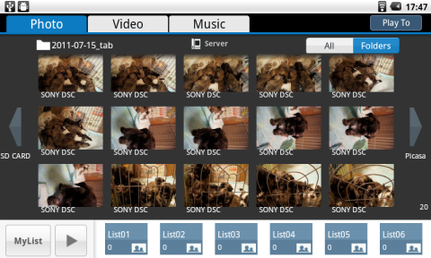 DLNAクライアントにも対応したMedia Playerだ。alimoでは、写真や動画などはAndroid標準アプリであるギャラリー、もしくはこのMedia Playerで閲覧することになる。また、こちらのMedia Playerを使えば音楽の再生も可能だ。DLNAプレイヤーとしては、Windows VistaのWindows Media Playerの共有機能を利用して試してみたのだが、フォルダやファイルの数が十数ファイル程度であれば速度的にもそれなりの速度で表示してくれるのではあるが、これが数十、数百となると、一覧が表示されるまで数分~十数分ほどかかってしまい、ちょっとお話にならない。その他のデバイスでも確認してみたが、ailmo特有のようであったので、ソフトの熟成を望みたいところ。また、画像共有サイトのPicasaにも対応しており、Picasaに表示されるファイルも表示することができる…はずなのだが、画像の通り、ファイル名は表示されるのではあるが、肝心な画像はなぜか表示させることができなかった…。表示できるファイル形式は基本的にMPEG4ファイルとなり1280x720/30pのハイビジョンファイルの再生も可能だった。もちろん画面解像度は800x480なので縮小して表示されることになるのだが、圧縮ノイズなどが見えなくなるので、スーパーサンプリングに近く、かなりの高画質での再生されているように見える。DLNAでファイル数大漁にある場合に一覧表示が遅いという問題は写真などの画像データでは問題になることもあるだろう物の、動画であれば1つのフォルダに大量のファイルが保存されることも少ないであろうことを考えると、動画であればそこそこ快適に利用できるように感じたが、やはり一覧表示などはラグなくささっと表示できるようにしてもらいたいものだ。このMedia Playerアプリもアップデート等で改善されることを望みたい。