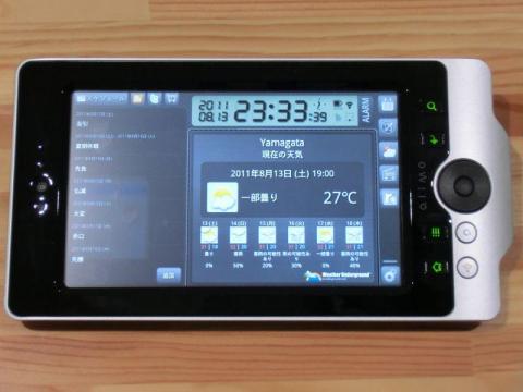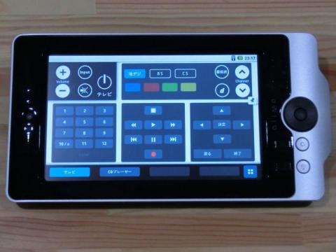 上記写真で見ると本体の右側が厚くなっており、デジタルフォトフレームのように立てて置いた状態で使うスタイルと、厚くなった部分に内蔵されたは赤外線送信部を使用してテレビ等の外部機器を操作するスタイルの使い方ができる。
