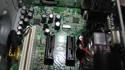 Inspiron580の場合2つのPCI Express空きポートがあります。今回は写真右側のグラフィックボードとの距離をとりたかったため、左側のPCI Expressポートに取り付けました。