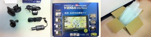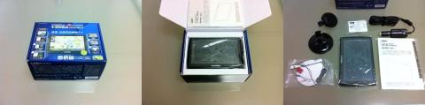ナビ本体の箱は、中にギッシリと詰め込まれており、同梱品としては、3枚目写真左列上から、クレードル、吸盤、取付冶具、バッテリ、本体、シガーソケット給電器、取扱説明書です。