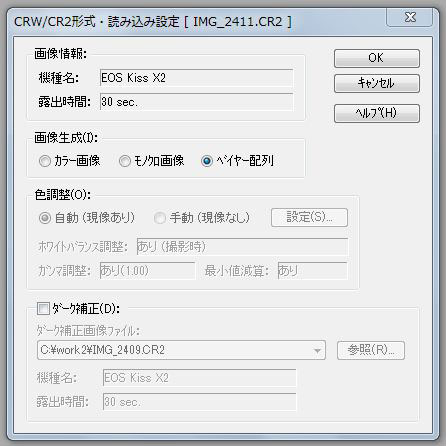 共通ダーク/フラット補正 の 設定メニューの中から、ダーク補正にチェックを入れてあらかじめ用意しておいたダーク補正画像ファイルを指定して、OKを選択します。