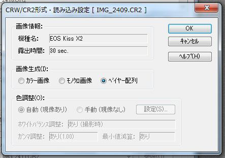 すると、どういう状態で読み取ればいいかを指定するウィンドウが表示されますので、ベイヤー配列を選びます。