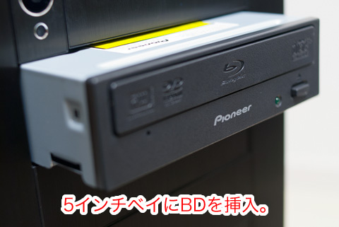 PCケースの5インチベイに付いているカバーを外し、BDを挿入、固定します。