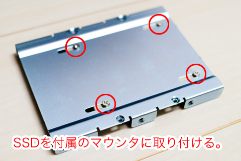 SSDは2.5インチサイズなので、3.5インチシャドウベイに取り付ける為に、付属のマウンタを取り付けます。