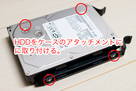 HDDをPCケース付属のアタッチメントに取り付けます。
