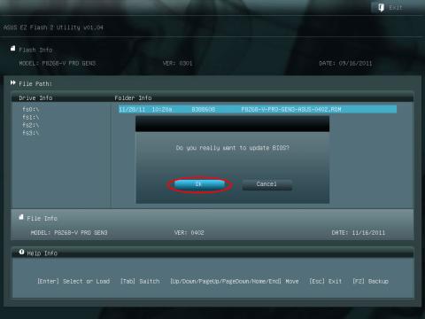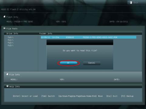 ASUS EZ Flash 2 Utilityのツール画面では、USBフラッシュメモリに保存されているBIOSファイルを確認することが出来ますので、バージョン0402のファイルを選択しクリックします。