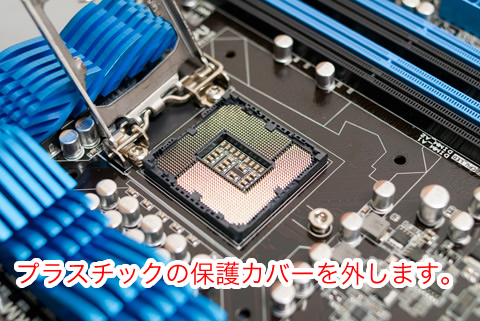 金属製のカバーを外したら、CPUソケットに付いているプラスチック製の保護カバーを外します。