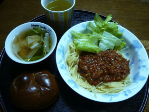 我が家はどんなに頑張っても、インテリア含め和洋折衷「おうち感」から抜け出せないので、緑茶におぼんのせの「ミートソーススパゲッティー」の写真で失礼いたします。