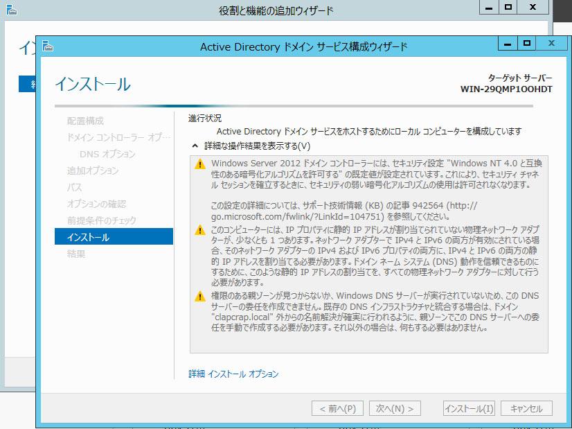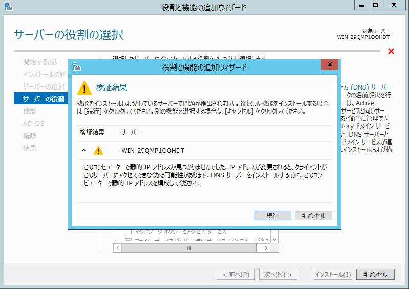 IPアドレスが動的(DHCP)だと叱られましたが、このまま進めます。