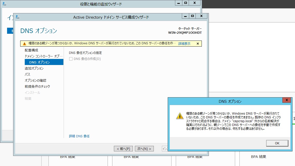 サクサクッっと進めてますが、ADインストールの時にDNSも入れておかないと後から追加出来ないことは無いですが、面倒です。