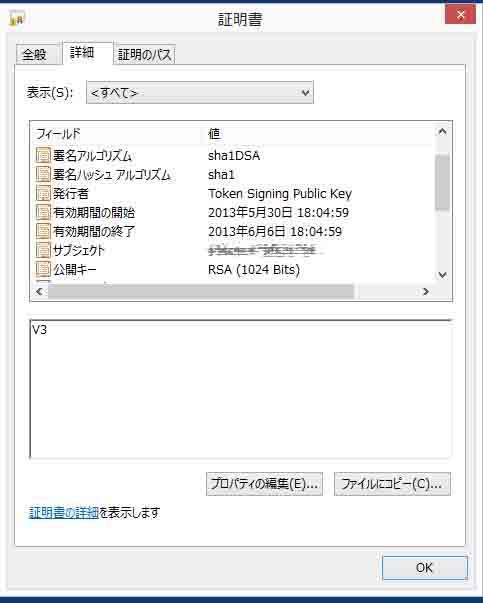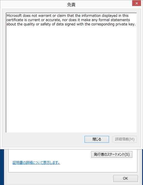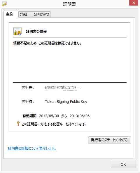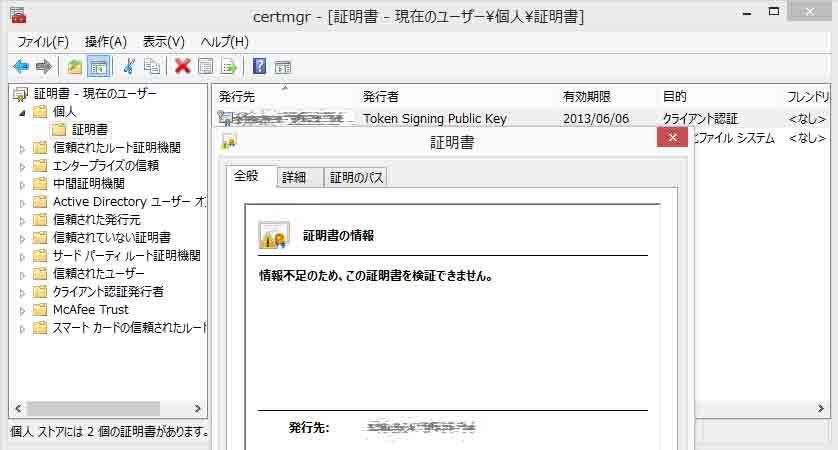 ダブルクリックすると「情報不足のため、この証明書を検証出来ません」。