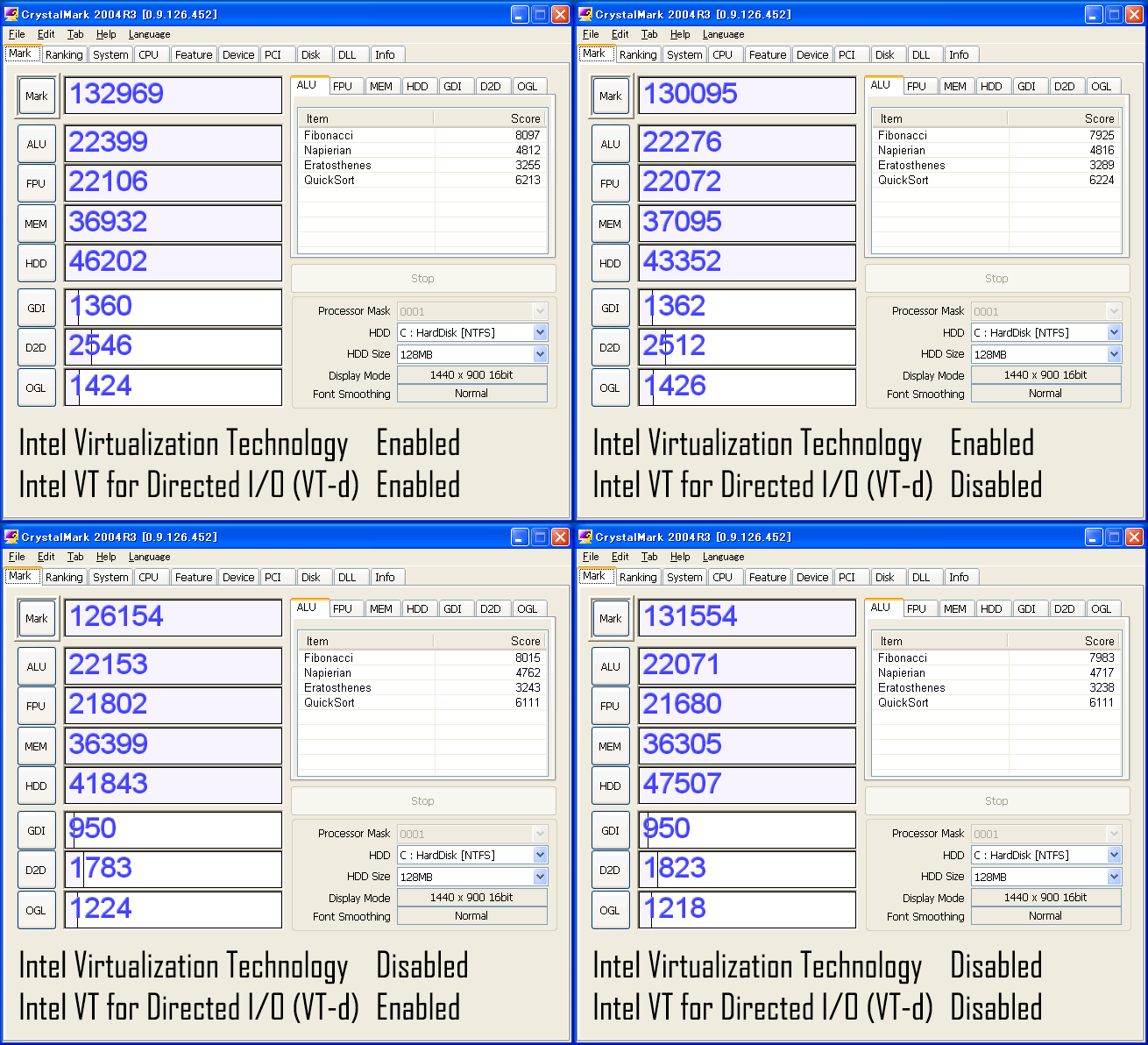 マザーボードの「Intel Virtualization Technology」と「Intel VT for Directed I/O (VT-d)」を両方オン・片方オン・両方オフの4パターンで計測だ。念のため複数回計測して真ん中辺りのスコアを出したものを結果としている。