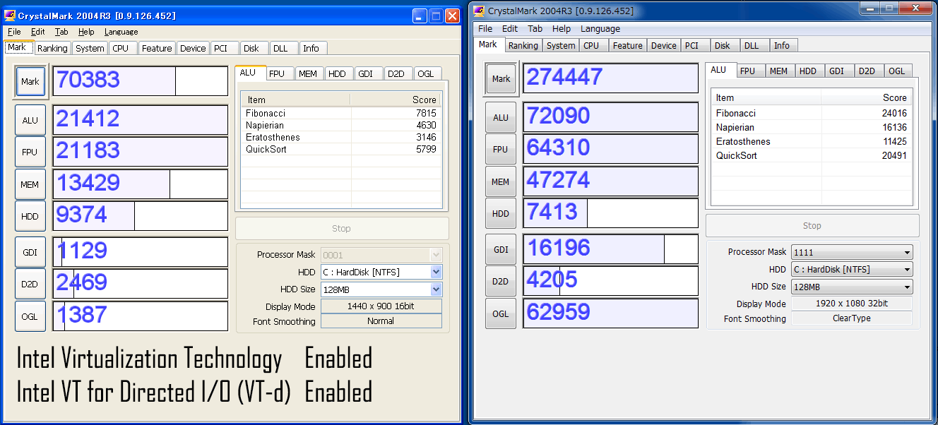ためしにXPmode内とホストOS(Windows7)側で同時にCrystalMark2004をぶん回してみた。VTは双方有効なので先ほどの左上のスコアと比べていただきたい。メモリこそ双方から同時アクセスしたせいでスコアが低下しているが、CPU周りのスコアは大した低下が見られない。CM2004R3自体が4スレッドまでの使用とはいえどんだけ余裕あるんだよお前は。