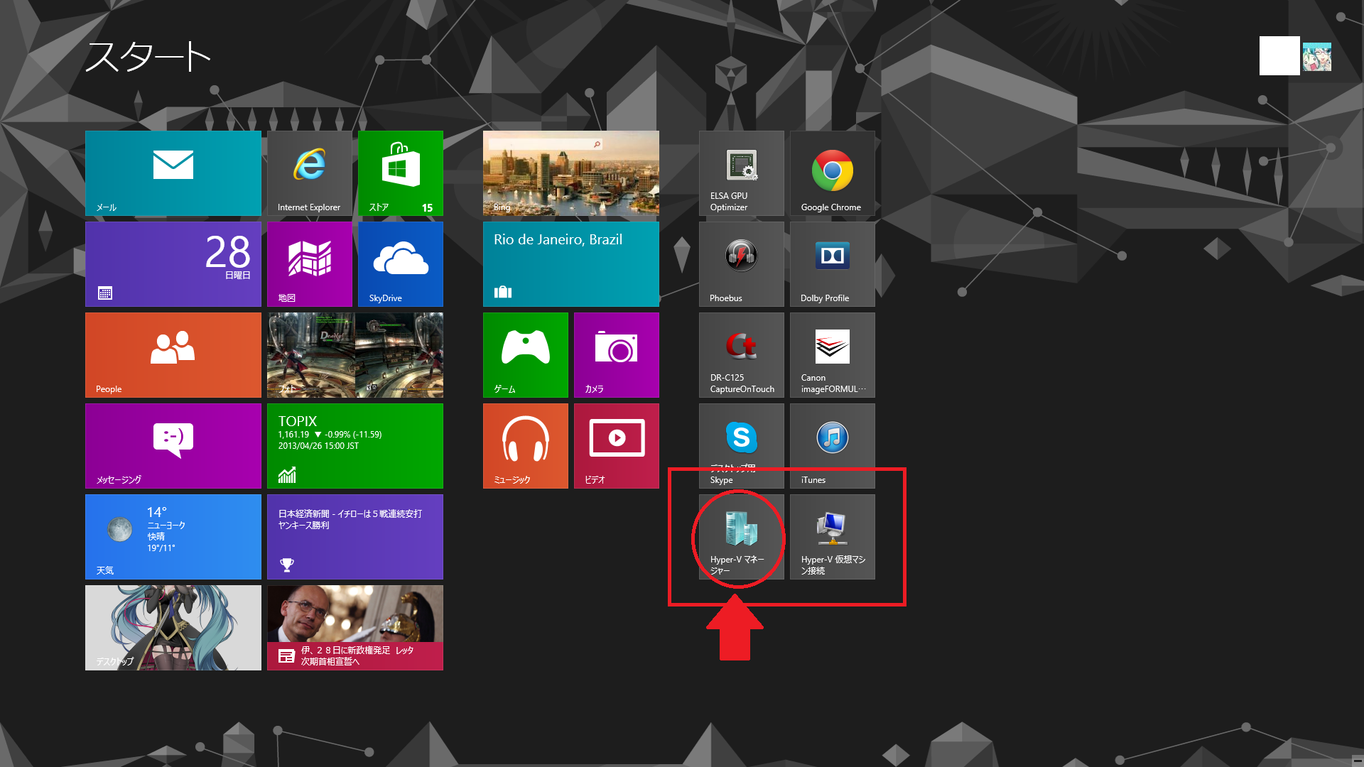 5:再起動が完了し、Modern UIに「Hyper-V マネージャー」「Hyper-V 仮想マシン接続」が表示されるので、「Hyper-V マネージャー」を起動します。