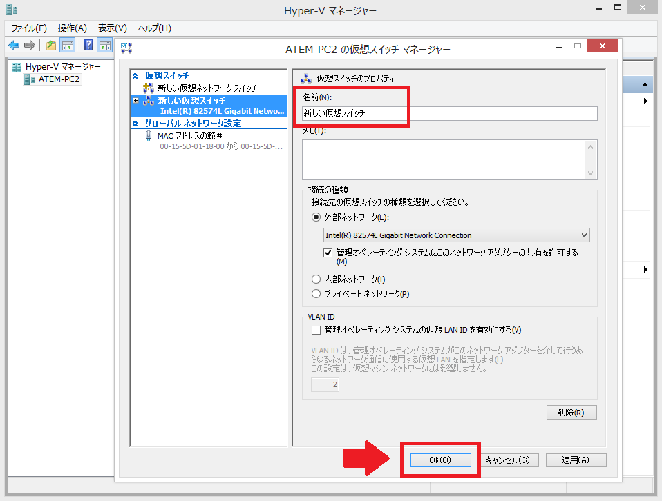 6:仮想マシンのためのネットワークアダプタを作らないと通信ができないので、表示された「Hyper-V マネージャー」の「仮想スイッチマネージャー」を開きます。