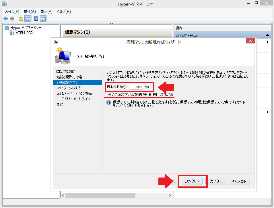 12:仮想マシンに割り当てるメモリを指定します。今回は特にわからなかったので、とりあえず「2048MB」を指定し、アンダーラインのある選択肢にチェックを入れました。
