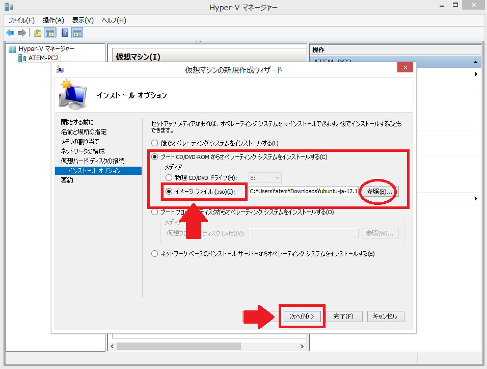 今回は「Ubuntu Desktop」のISOイメージがあるので、「ブート CD/DVD-ROM からオペレーティングシステムをインストールする」を選択し、「イメージファイル」にチェックをし、ISOイメージを選択します。