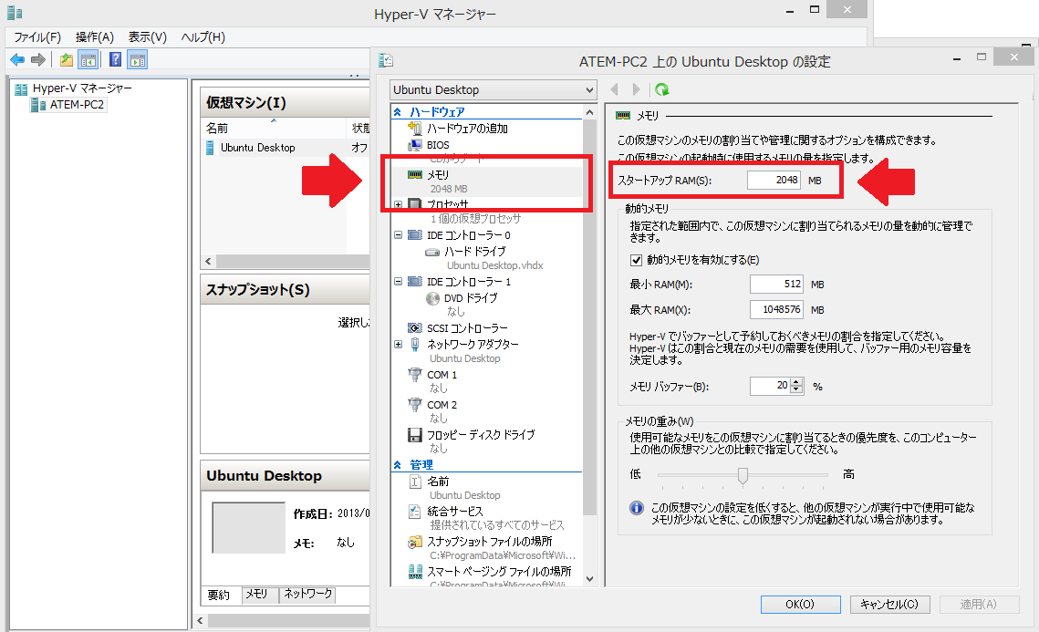 設定は「Hyper-V マネージャー」に表示されている「設定」から行えます。