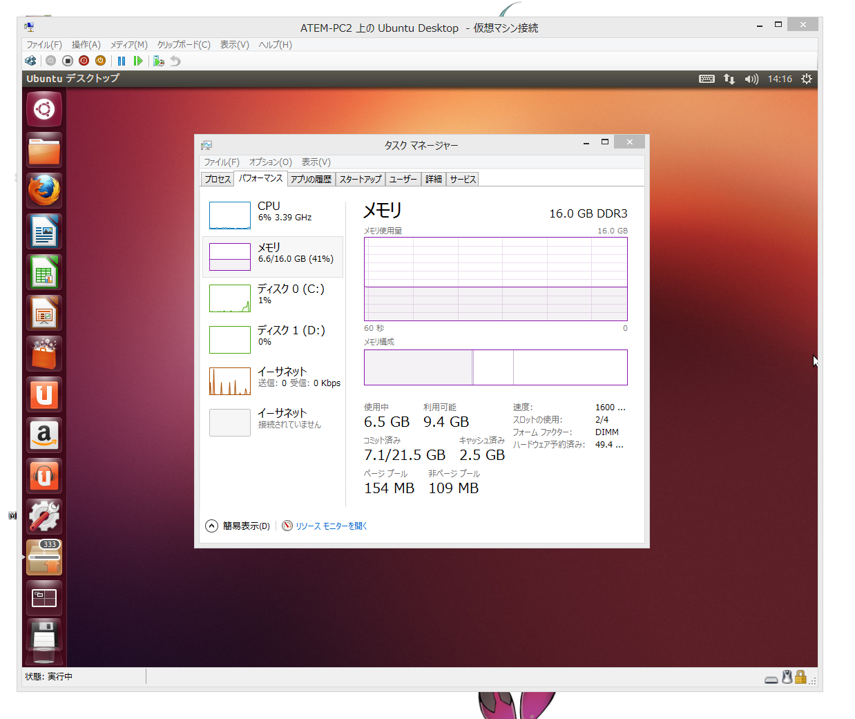 その後、仮想マシンのUbuntuを起動した状態で、Windows側のタスクマネージャーを開いてみました。
